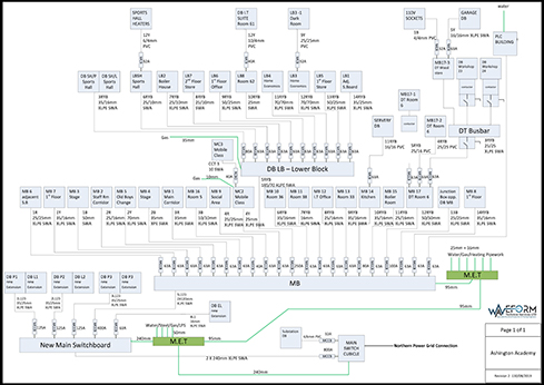 The schematic diagram pictured opposite shows the main distribution and earthing system for a large high school academy. We can update schematic diagrams on a regular basis for our clients to add additions and alterations as requested.